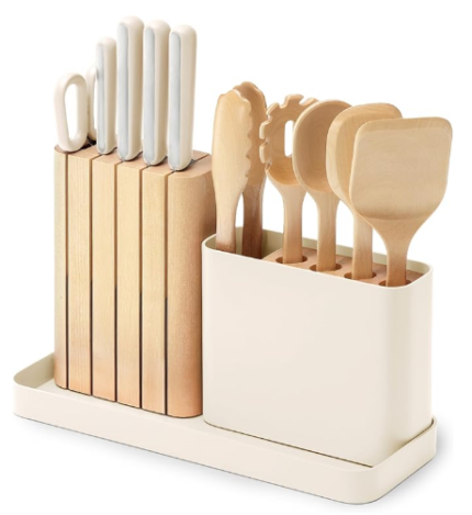 14-Piece Kitchen Prep Set - Kitchen Knife Set & Wooden Utensil Set - Made with Premium German Steel Blades & FSC-Certified Birch Wood - Non-Toxic Materials - Includes Organizer - Cream