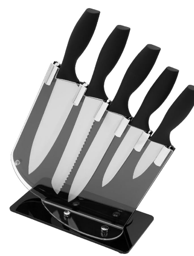 Style A sleek stainless steel finish paired with ergonomic black handles creates a clean, modern look. The built-in sharpener is integrated into a streamlined block, adding a professional and high-tech visual element. The set is minimal and contemporary, designed to complement modern kitchens.A sleek stainless steel finish paired with ergonomic black handles creates a clean, modern look. The built-in sharpener is integrated into a streamlined block